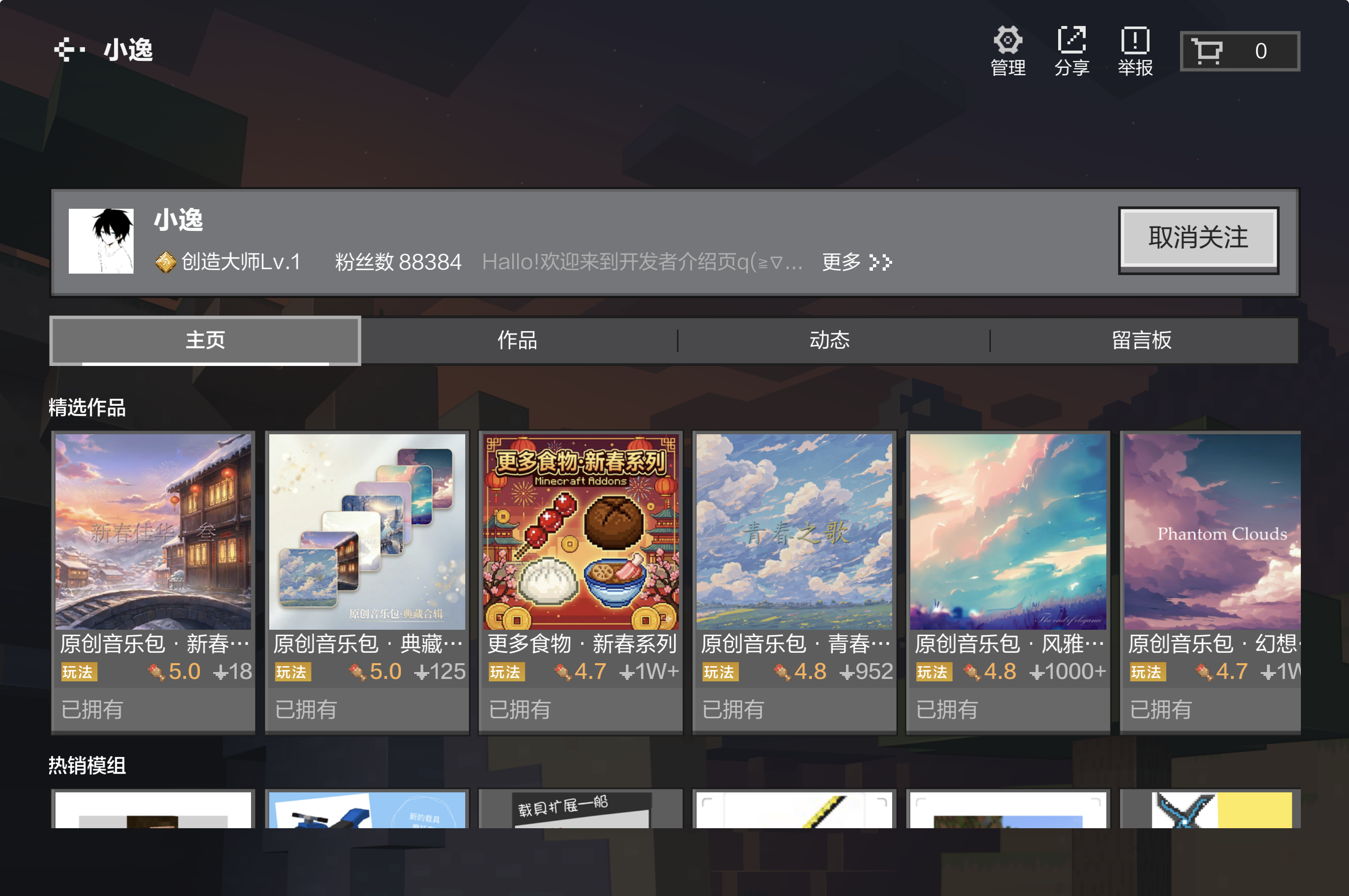 作为注册开发者,我致力于将原创影视级管弦配乐作为背景音乐与原声唱片融入游戏体验。让方块世界不再生硬,深受百万玩家喜爱。点击下方链接将跳转至我的世界中国版附加内容商城页面。
